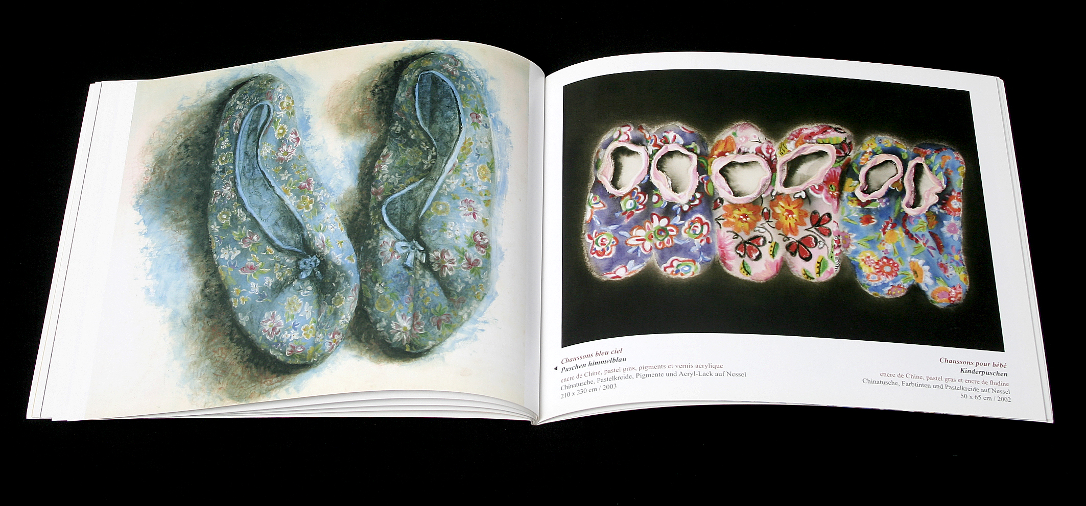 Mi-Young Kim est coréenne et vit en France. Le catalogue a été produit à l’occasion de sa première exposition allemande en octobre / novembre 2005 à Nienburg. Dans la série Les Chaussons Mi-Young Kim travaille avec des encres de couleur et de l’encre de Chine. Il s’agit d’un projet artistique classique que seulement une femme était capable d’imaginer. Les tableaux ont été reproduits de façon professionnelle. La composition et la mise en page ont été réalisées par Mark Rozov. Le catalogue a été imprimé à Hanovre.
