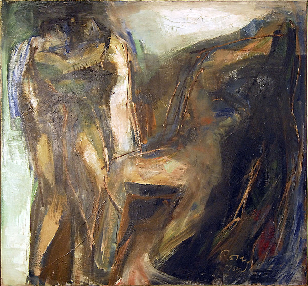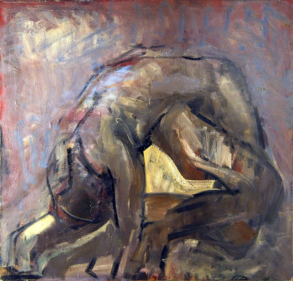 At the beginning of the 1960s he realizes his best known oil paintings: large groups of figures, often dramatically and darkly tinted by violent brush strokes, the figures themselves often staggering and falling. In spite of the impulsive gesture, these pictures are beared by an elaborated conception determined by scenic posture and movement, but whose basic concept remains figurative and thematically structured.